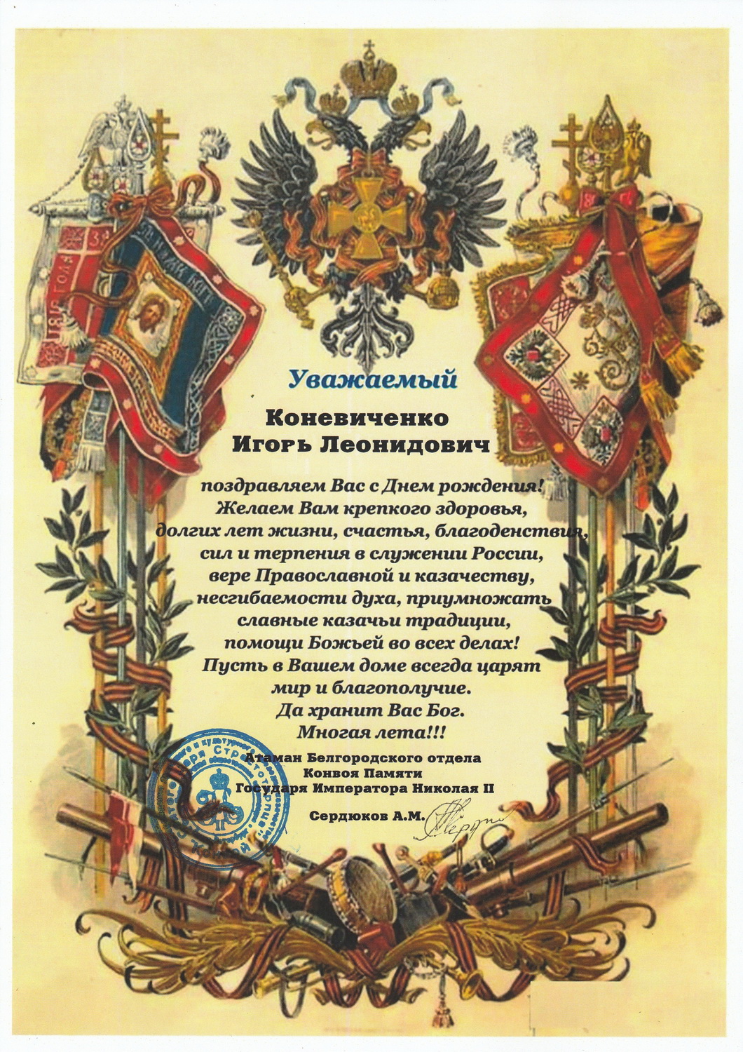 12 апреля 2026 года. Поздравление с Юбилеем – 60-летием настоятелю храма Тихвинской иконы Божией Матери Сестрорецка, духовнику Конвоя Памяти Государя Императора Николая II архимандриту Гавриилу (Коневиченко) от казаков Белгородского отдела Конвоя Памяти Государя Императора Николая II