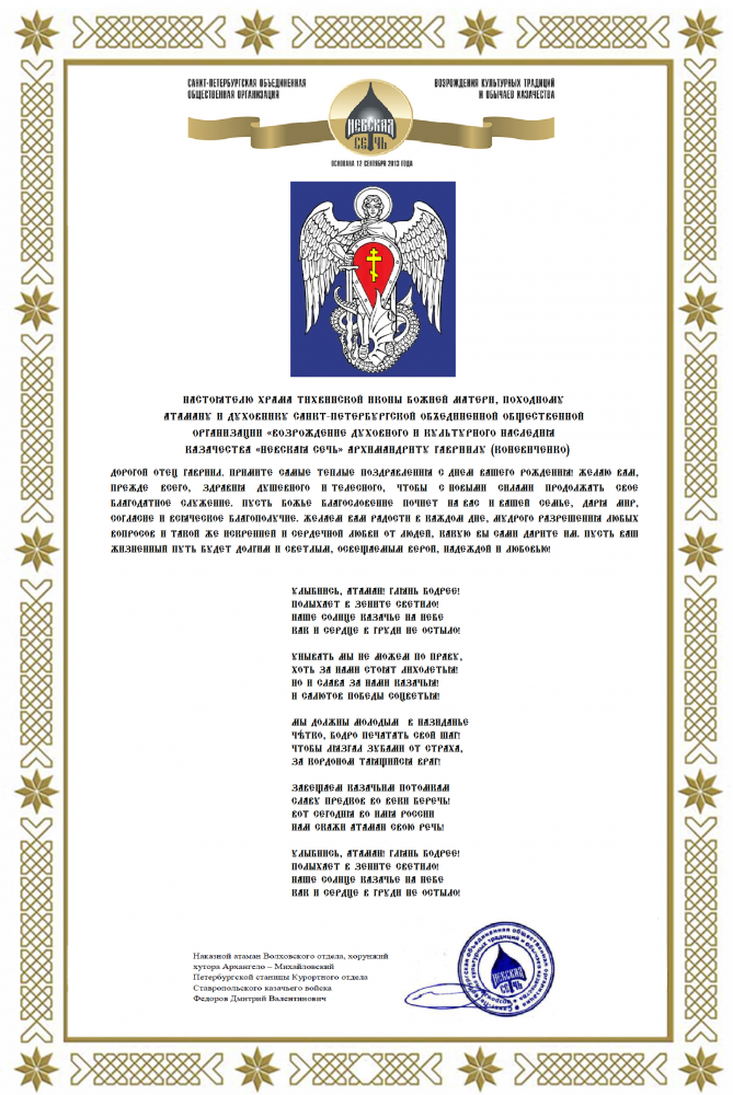 12 апреля 2026 года. Поздравление с Юбилеем – 60-летием настоятелю храма Тихвинской иконы Божией Матери Сестрорецка, духовнику Конвоя Памяти Государя Императора Николая II архимандриту Гавриилу (Коневиченко) от казаков Волховского отдела казачьей общины «Невская сечь»
