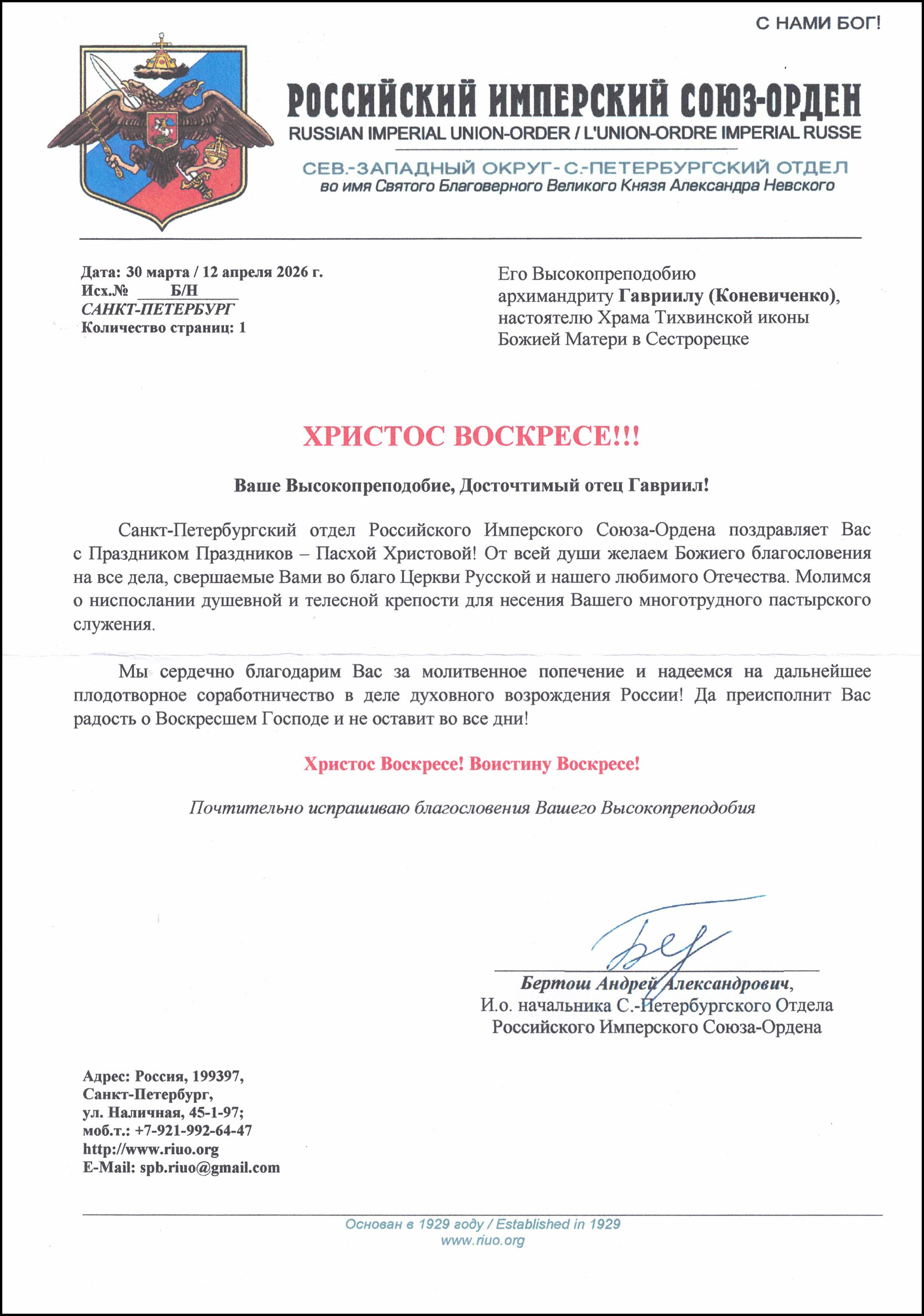 12 апреля 2026 года. Поздравление настоятелю храма Тихвинской иконы Божией Матери города Сестрорецка архимандриту Гавриилу (Коневиченко) со Светлым Христовым Воскресеньем от Российского Имперского Союза-Ордена