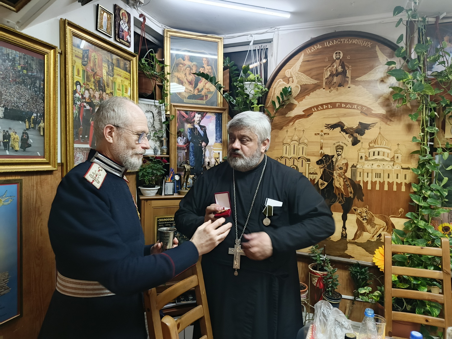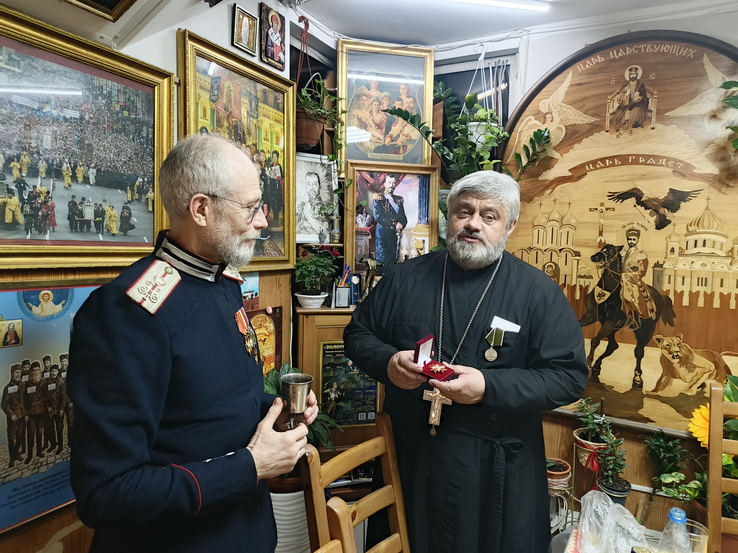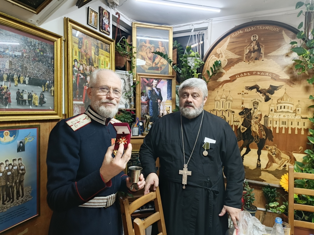 Командир Санкт-Петербургского Лейб-гвардии Казачьего дивизиона, вахмистр Конвоя Памяти Государя Императора Николая II есаул Илья Пивник поздравил настоятеля храма Тихвинской иконы Божией Матери города Сестрорецка, духовника Конвоя архимандрита Гавриила (Коневиченко) с Юбилеем — 60-летием и вручил ему знак «Лейб-Гвардии Казачий полк».