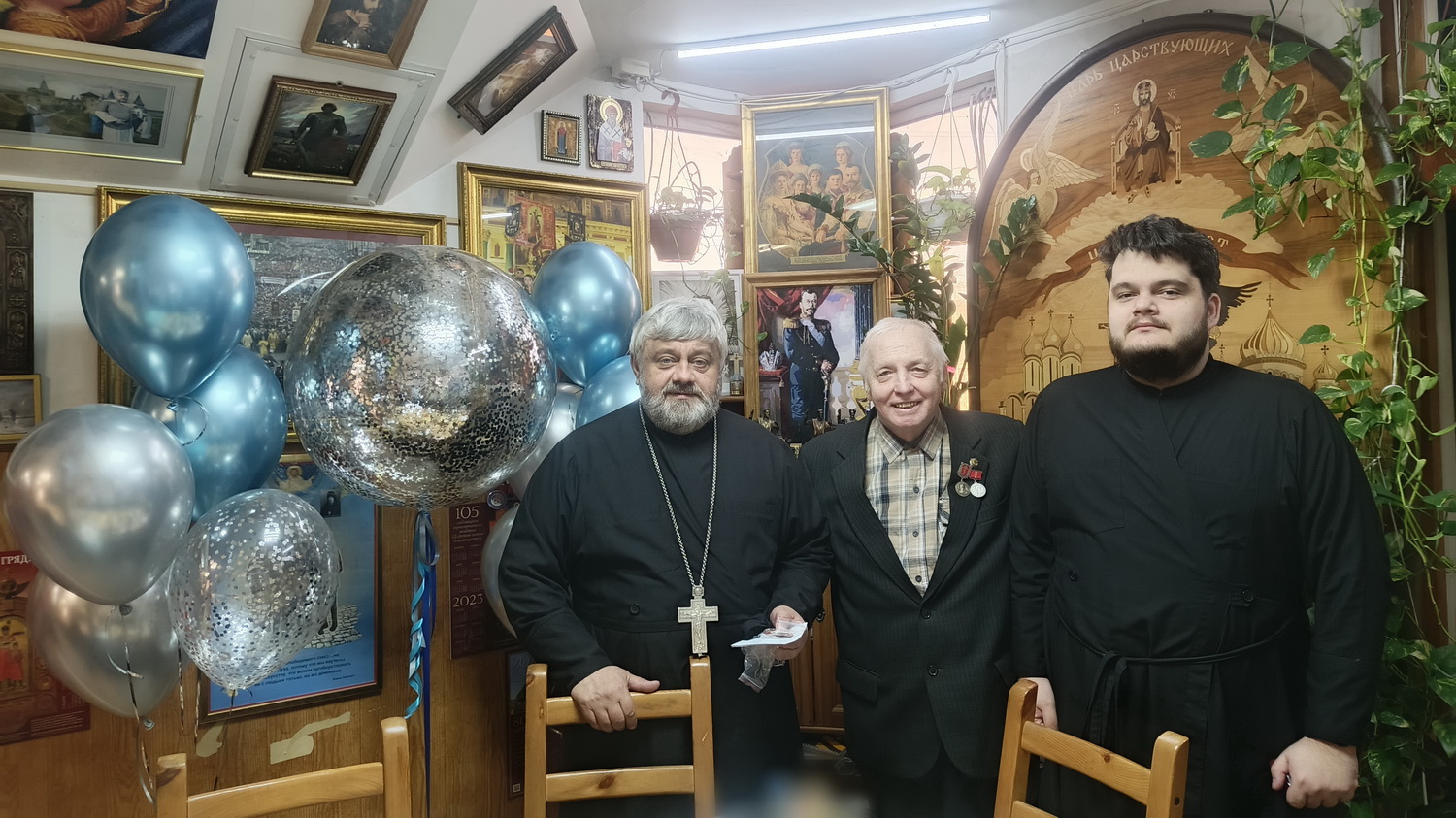 12 апреля 2026 года. Настоятеля храма Тихвинской иконы Божией Матери города Сестрорецка архимандрита Гавриила (Коневиченко) с Юбилеем – 60-летием поздравил председатель совета стариков казачьей общины «Невская сечь» Александр Михайлович Кустов