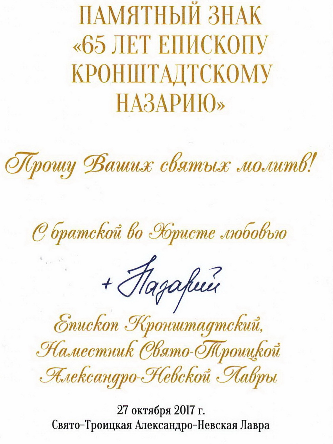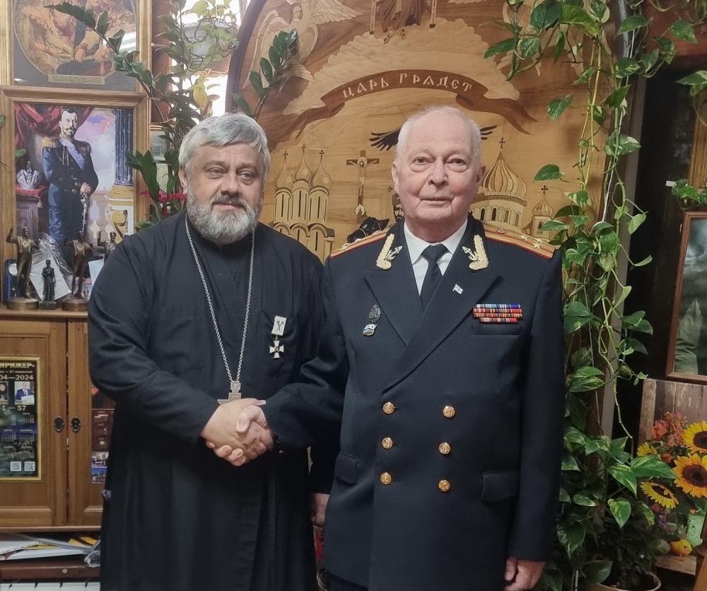 Председатель Совета ветеранов-подводников города Сестрорецка полковник Никитин Евгений Александрович поздравил настоятеля храма Тихвинской иконы Божией Матери города Сестрорецка архимандрита Гавриила (Коневиченко) с Юбилеем — 60-летием и вручил ему памятный знак «65 лет епископу Кронштадтскому Назарию».