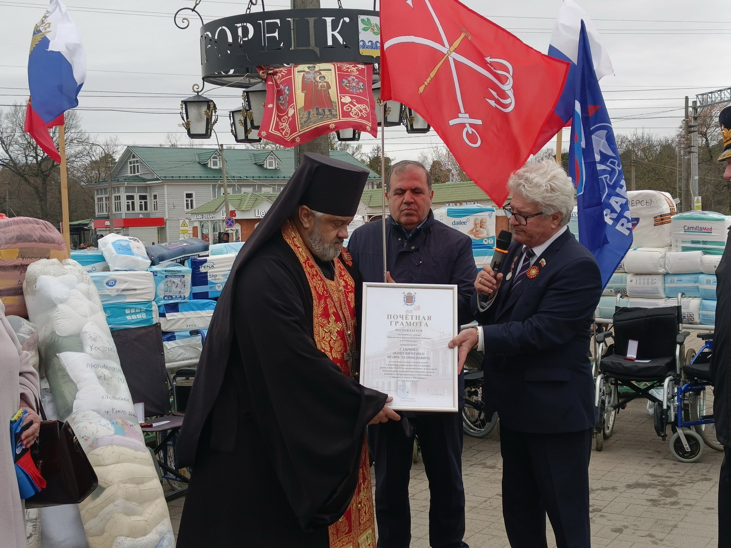 30 апреля с территории Духовно-просветительского центра при храме Тихвинской иконы Божией Матери города Сестрорецка, с благословения настоятеля храма, духовника казачьей общины «Конвой Памяти Государя Императора Николая II» архимандрита Гавриила (Коневиченко), отправился гуманитарный груз для участников СВО, проходящих лечение в госпиталях Санкт-Петербурга, Белгорода, Горловки.