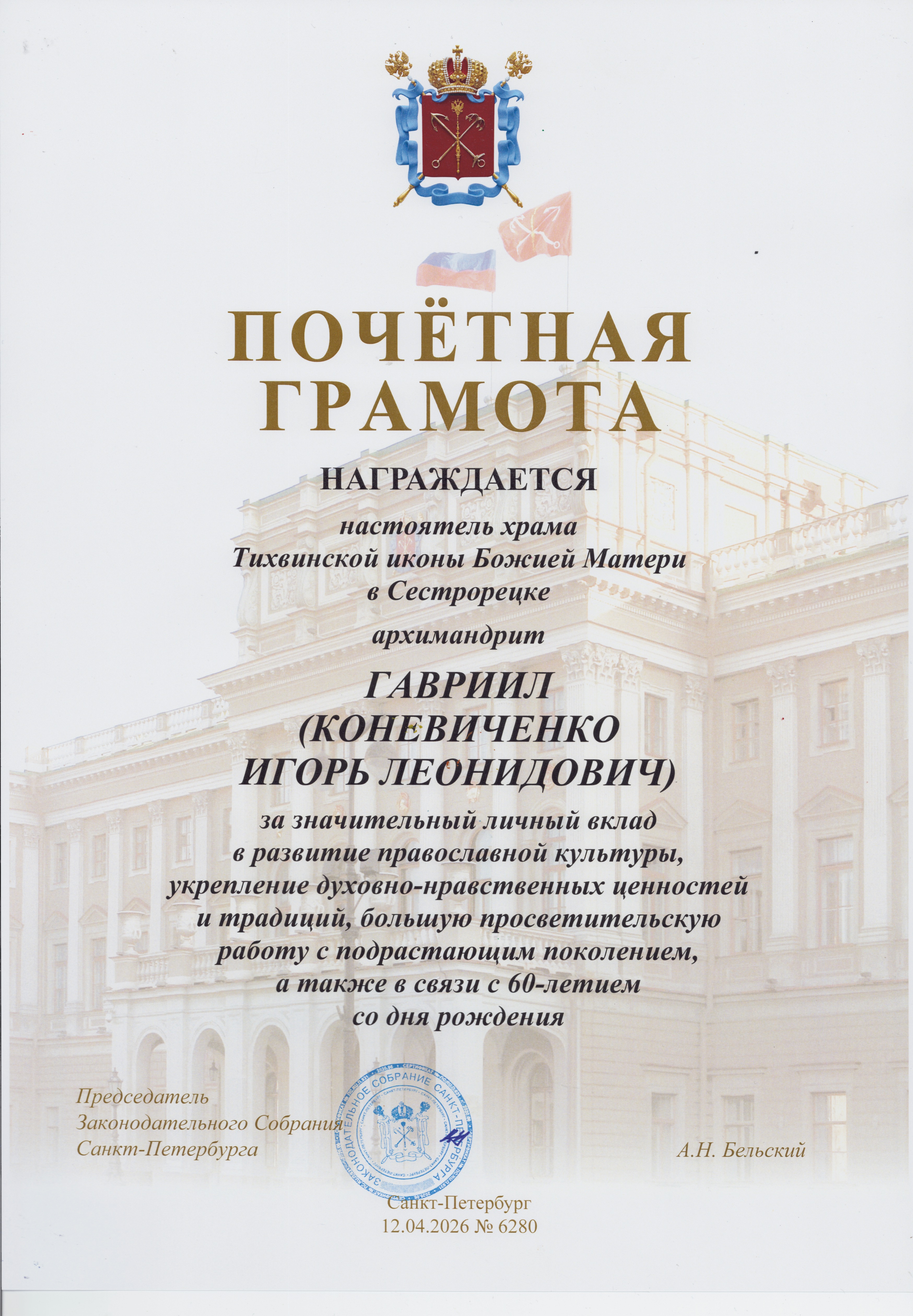 Полномочный представитель Председателя Законодательного Собрания Санкт-Петербурга по связям с органами государственной власти Александр Александрович Ваймер выполнил ответственную миссию – вручил архимандриту Гавриилу (Коневиченко) Почетную грамоту от Председателя Законодательного Собрания Санкт-Петербурга А. Н. Бельского. Почетная грамота была вручена отцу Гавриилу за значительный личный вклад в развитие православной культуры, укрепление духовно-нравственных ценностей и традиций, за оказание гуманитарной помощи бойцам СВО, а также в связи с 60-летием.