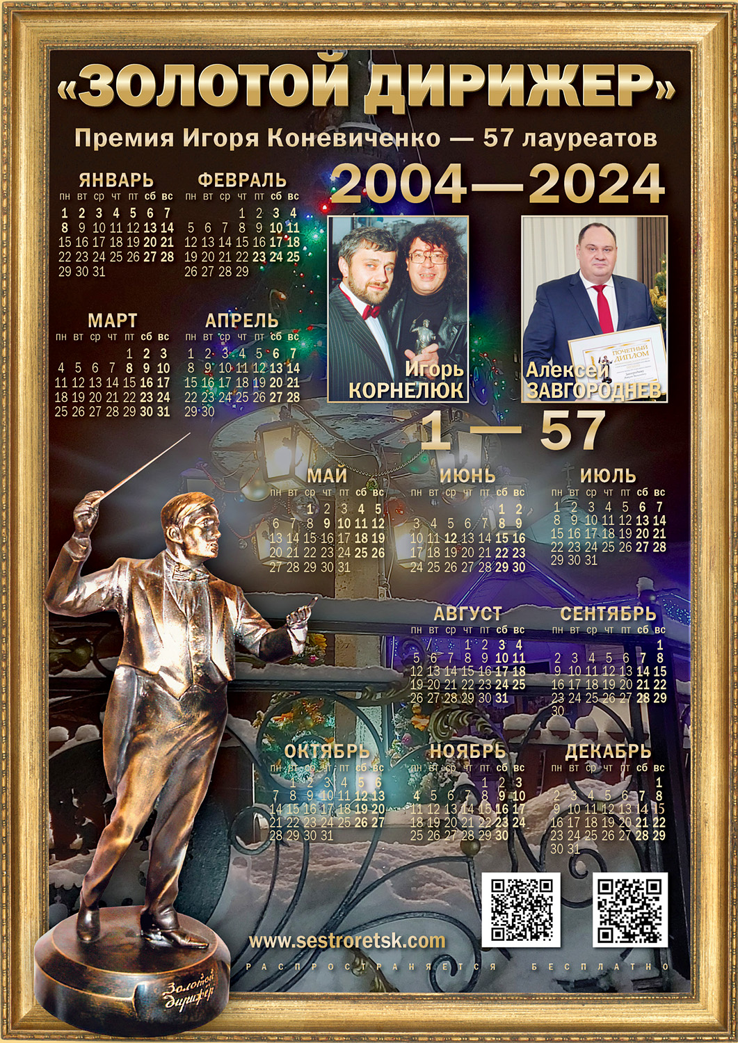 Именная премия Игоря Коневиченко « Золотой дирижер» была учреждена в 2004 году, к 290-летию города Сестрорецка. Тогда же состоялся первый фестиваль « Берега», в котором приняли участие творческие коллективы, певцы, как начинающие, так и хорошо известные. Почетным гостем международного фестиваля был Игорь Корнелюк, который стал первым лауреатом премии. Статуэткой дирижера также были награждены и все победители первого конкурса. С того момента прошло почти 8 лет, но премия живет, ежегодно вручаются несколько наград в номинациях: — за творческие достижения в области культуры и искусства; — за вклад в развитие духовной и культурной жизни общества; — за выдающийся вклад в возрождение воинских культурных традиций. За это время лауреатами стали такие известные люди, как постановщик массовых праздников Олег Орлов, певец Виктор Салтыков, основатель и директор музея Остапа Бендера Анатолий Котов. Премия вручена Александру Мартынову, верховному атаману Союза казаков России и еще нескольким представителям казачьих организаций, которые внесли большой вклад в возрождение казачества. За вклад в развитие духовной жизни общества именная премия известного общественного деятеля, почетного гражданина Сестрорецка, а ныне — архимандрита Гавриила ( Коневиченко) вручалась представителям духовенства России и Украины.Положение об именной премии Игоря Коневиченко « Золотой дирижер»
