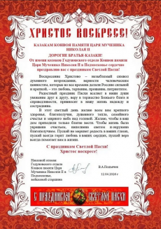 12 апреля 2026 года. Поздравление казакам Конвоя Памяти Государя Императора Николая II с праздником Светлой Пасхи от казаков Годуновского отдела Конвоя в Подмосковье и Столичной сотни СКВ СКР