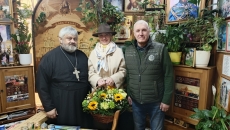 12 апреля 2026 года. Настоятеля храма Тихвинской иконы Божией Матери архимандрита Гавриила (Коневиченко) с Юбилеем – 60-летием поздравила Елена, флорист из цветочного салона «Разноцвет»
