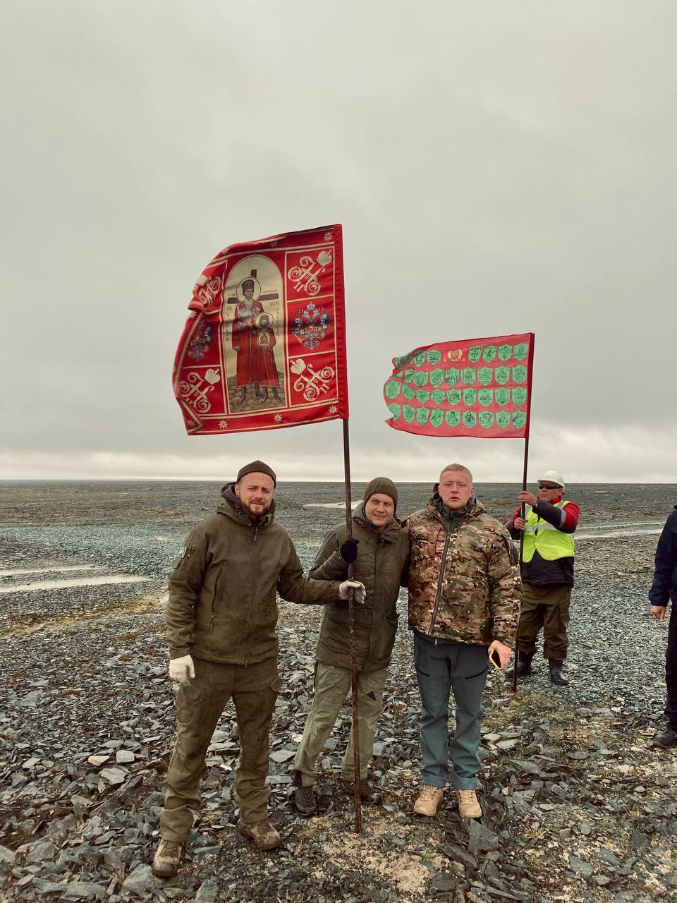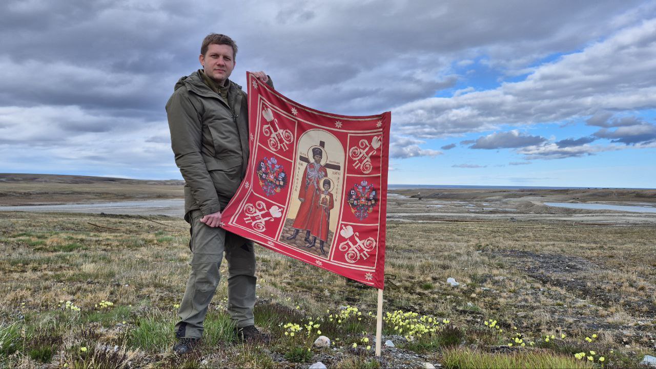 Поскольку наша высадка здесь случилась в дни, когда Россия с передовой и по всему тылу поднимает свое древнее национальное знамя – Спас Нерукотворный, — мы водрузили здесь его, стараясь приблизиться к тому чувству, которое пережили здесь первые открыватели этой земли.