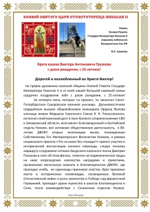 3 ноября 2025 года казаку Конвоя Памяти Государя Императора Николая II, старшему лейтенанту Вооруженных сил РФ В.А. Грузкову исполняется 25 лет. Поздравительный адрес