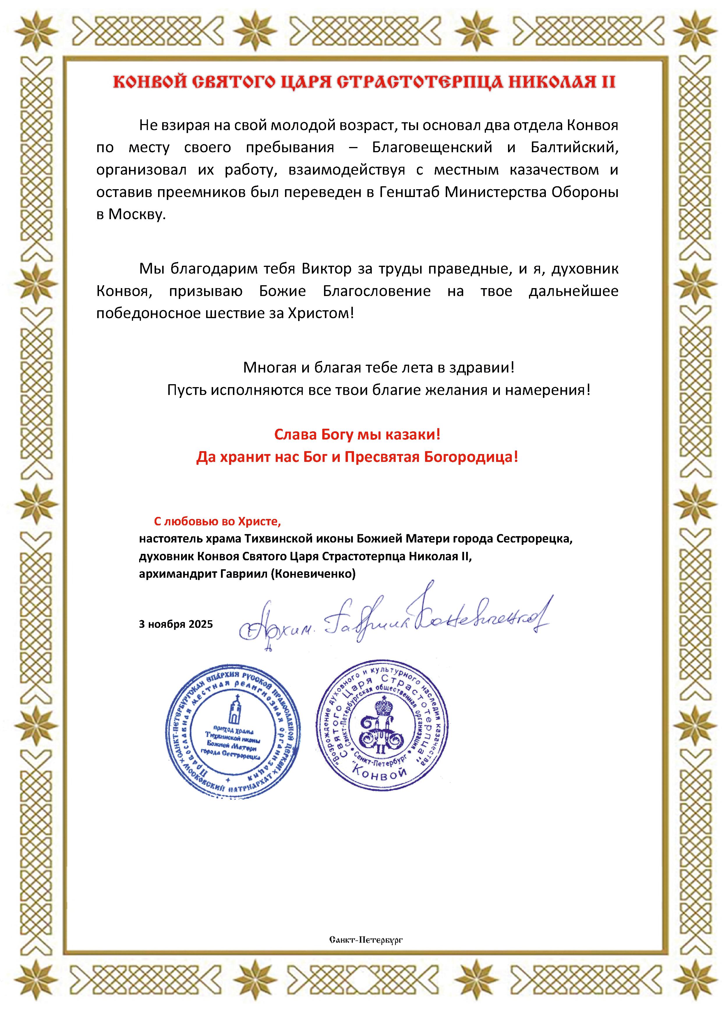 3 ноября 2025 года казаку Конвоя Памяти Государя Императора Николая II, старшему лейтенанту Вооруженных сил РФ В.А. Грузкову исполняется 25 лет. Поздравительный адрес