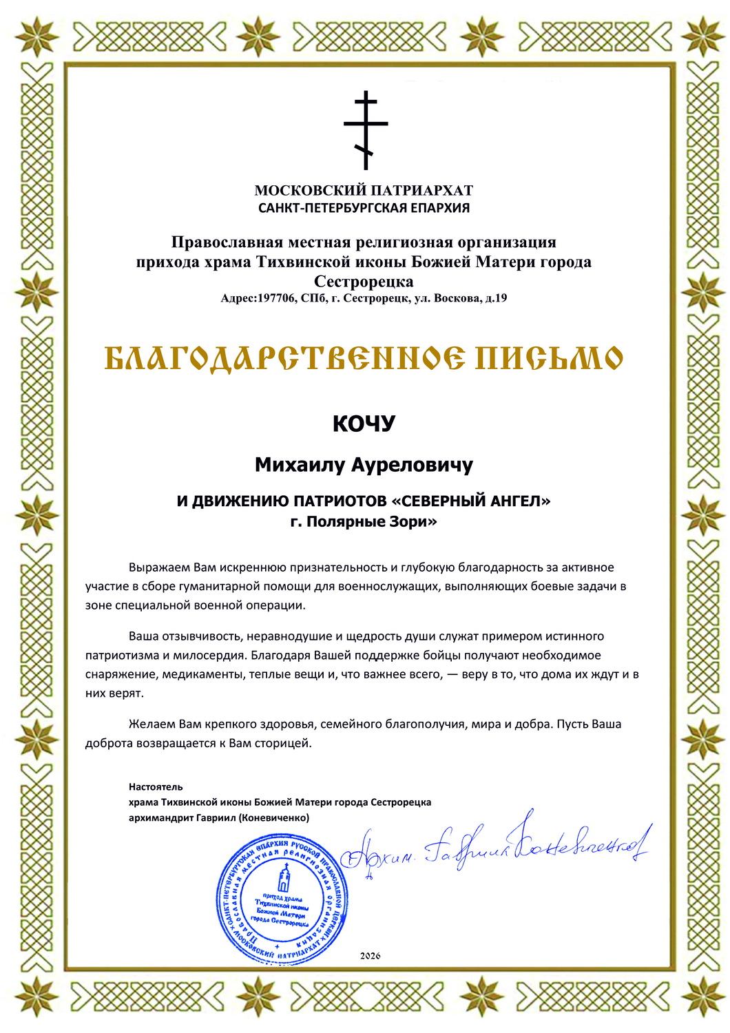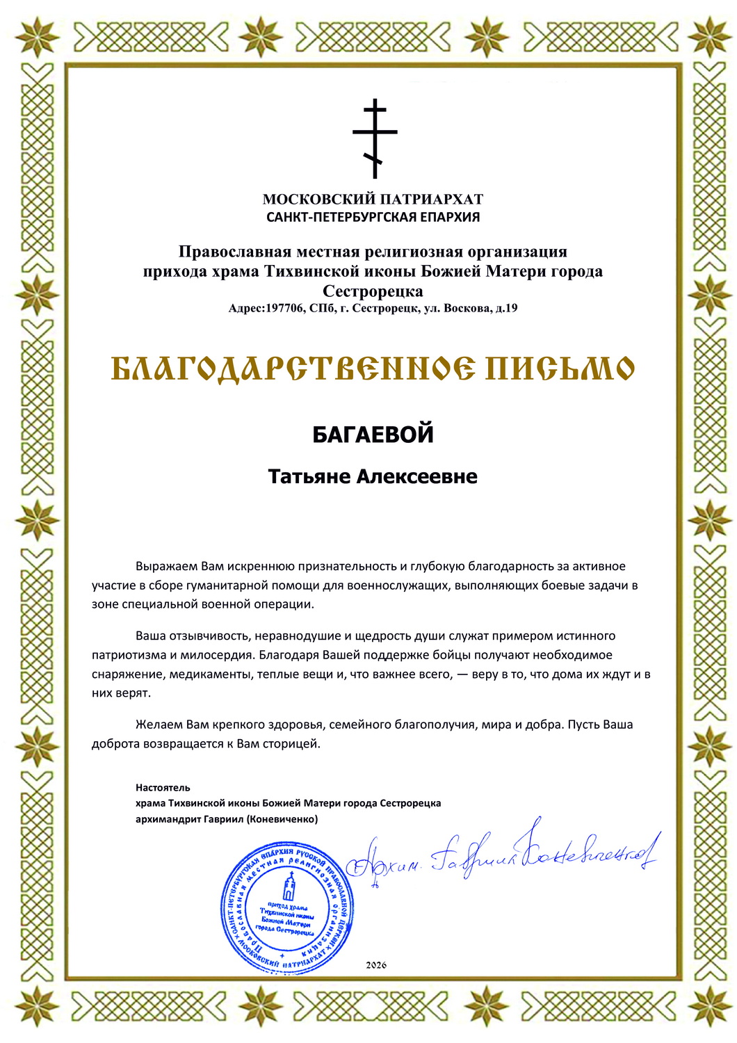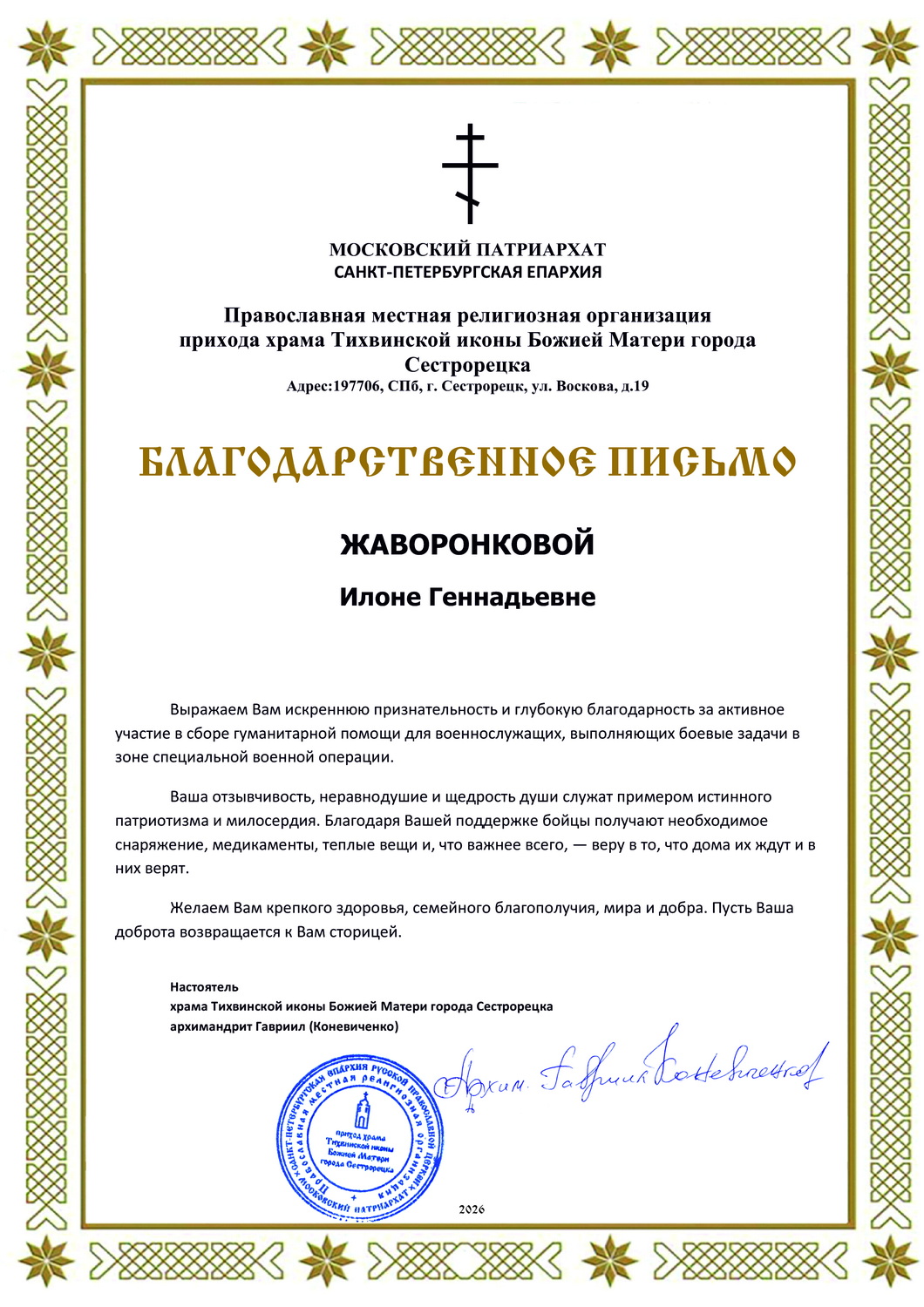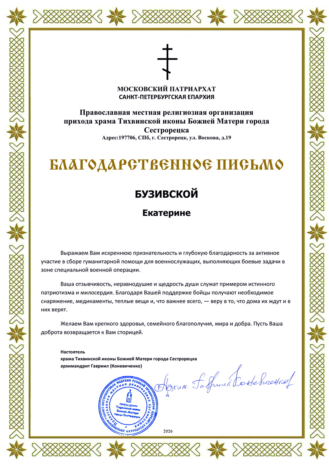 6 апреля 2026 года. Благодарственные письма за активное участие в сборе гуманитарной помощи для военнослужащих, выполняющих боевые задачи в зоне специальной военной операции от настоятеля храма Тихвинской иконы Божией Матери города Сестрорецка архимандрита Гавриила (Коневиченко)