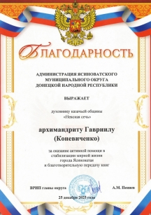 Благодарность духовнику казачьей общины «Невская сечь» архимандриту Гавриилу (Коневиченко) от администрации Ясиноватского муниципального округа Донецкой Народной Республики