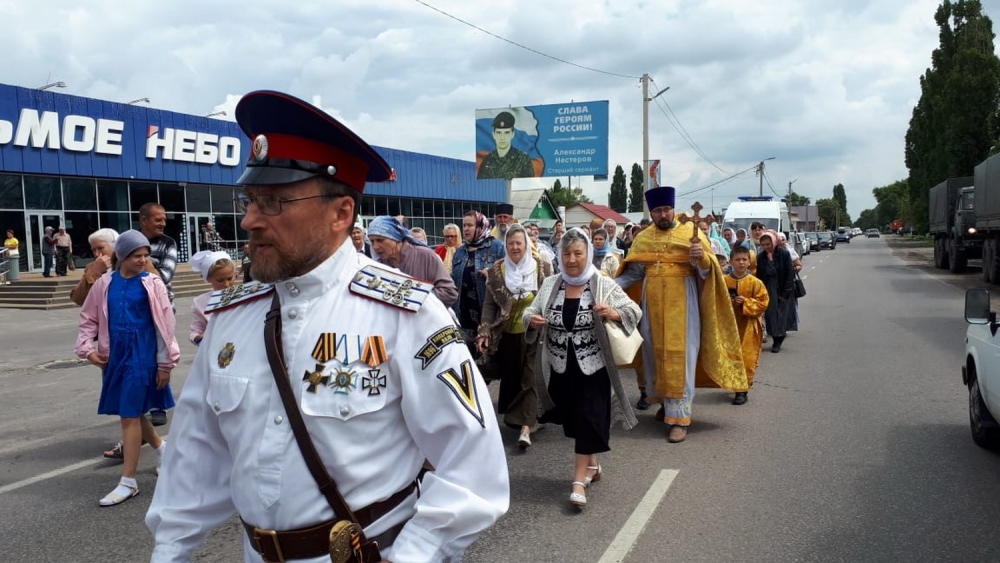 Батюшки кропят жителей и улицы города святой водой, остановки происходят на каждом перекрёстке. Сегодня, по пути следование на боевые рубежи, в Новохопёрске остановилась колонна военных машин. Отец Сергий окропил технику и благословил воинов, вышедших навстречу прихожанам.