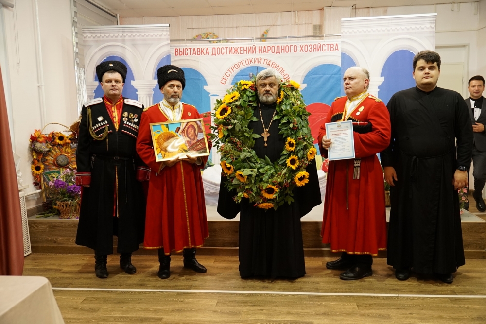 В этот раз на выставку представили результат своего труда настоятель храма Тихвинской иконы Божией Матери города Сестрорецка, духовник казачьей общины «Невская сечь» архимандрит Гавриил (Коневиченко) вместе с казаками общины. Они вырастили самые гигантские в нашем городе и, возможно, даже во всем Курортном районе подсолнухи. Высота некоторых подсолнухов достигает 4,5 метра.