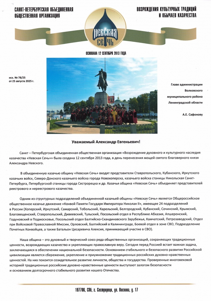 25 августа 2025 года. Письмо Главе администрации Волховского муниципального района Ленинградской области А.Е. Сафонову от Объединённой общественной организации возрождения духовного и культурного наследия казачества «Невская сечь»