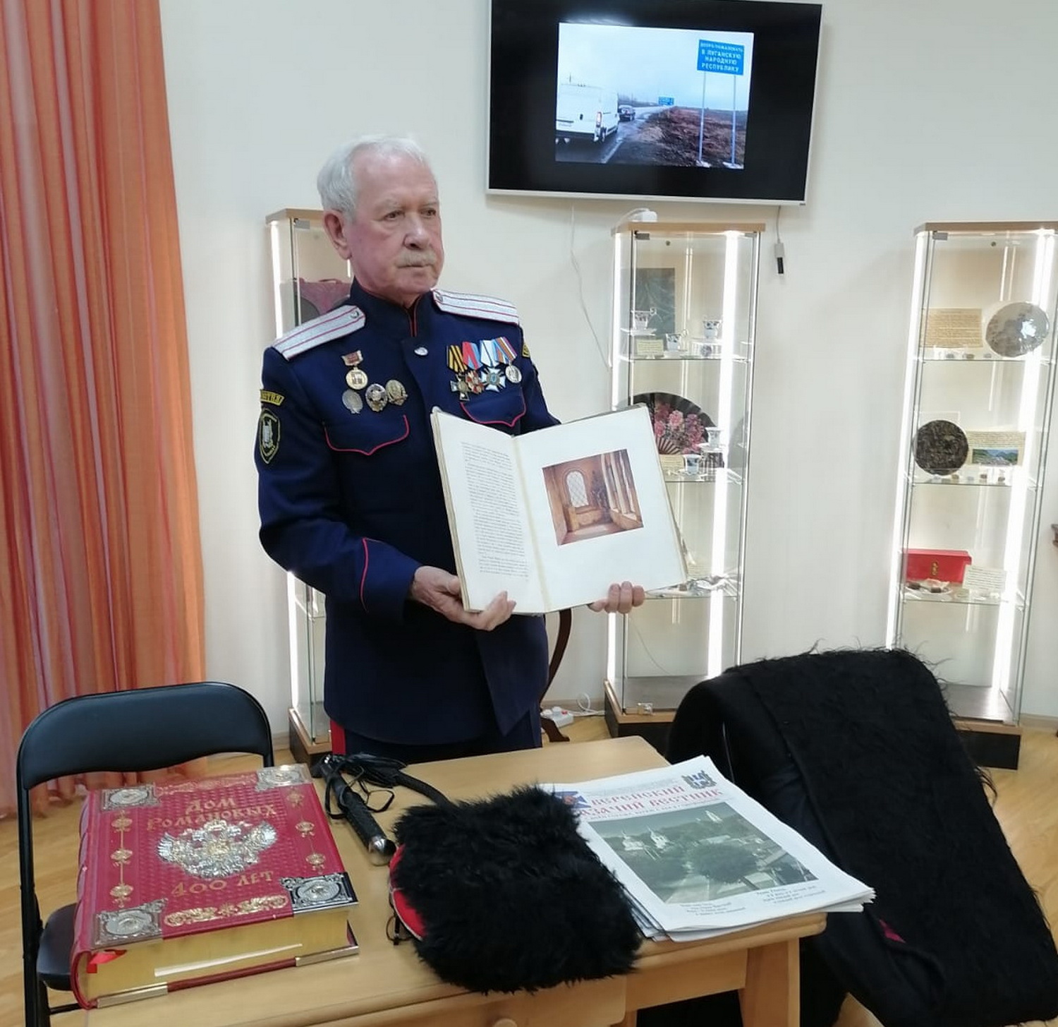 В заключение Ю.В. Комаровский рассказал о своей семье, где на протяжении семи поколений сохраняются традиции казачества, а родной прадед Тимофей Тимофеевич Коренев, станичный атаман, даже состоял в Конвое Верховного атамана России Цесаревича Николая во время его путешествия на Дальний Восток. Юрий Владимирович показал и раритеты, касающиеся царской семьи, хранящиеся в его семье.