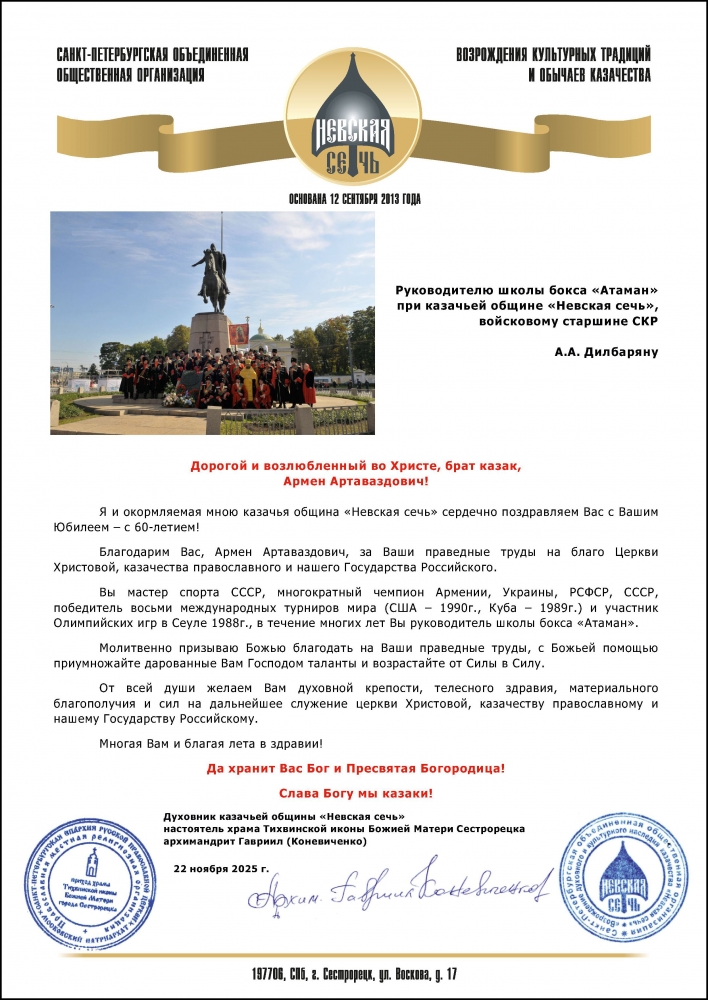 22 ноября 2025 года руководителю школы бокса «Атаман» при казачьей общине «Невская сечь», войсковому старшине СКР А.А. Дилбаряну исполняется 60 лет. Поздравительный адрес