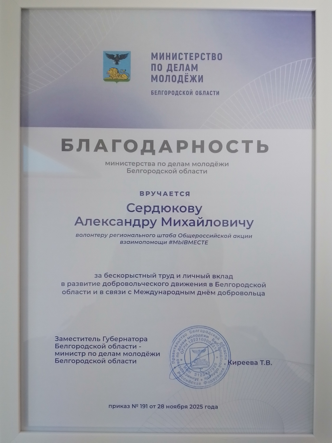 Министерская грамота вручена А.М. Сердюкову как волонтеру регионального штаба Общероссийской акции взаимопомощи #МЫВМЕСТЕ за бескорыстный труд и личный вклад в развитие добровольческого движения в Белгородской области и в связи с Международным днем добровольца.