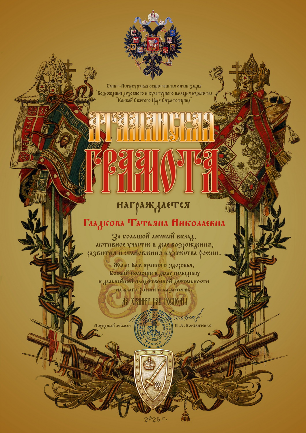 Награды были присуждены от имени Санкт-Петербургской общественной организации «Возрождение духовного и культурного наследия казачества Конвой Святого Царя Страстотерпца» за личный вклад в возрождение и становление казачества на Камчатской земле. Грамота подписана походным атаманом Конвоя Памяти Государя Императора Николая II И.Л. Коневиченко.