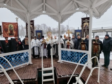 После Божественной литургии молящиеся вышли к емкости с водой к зданию Духовно-просветительского центра, где настоятель храма Тихвинской иконы Божией Матери Сестрорецка архимандрит Гавриил (Коневиченко) совершил Великое Водосвятие. Батюшка окропил всех святой водой и поздравил с праздником Крещения Господня, Богоявлением.