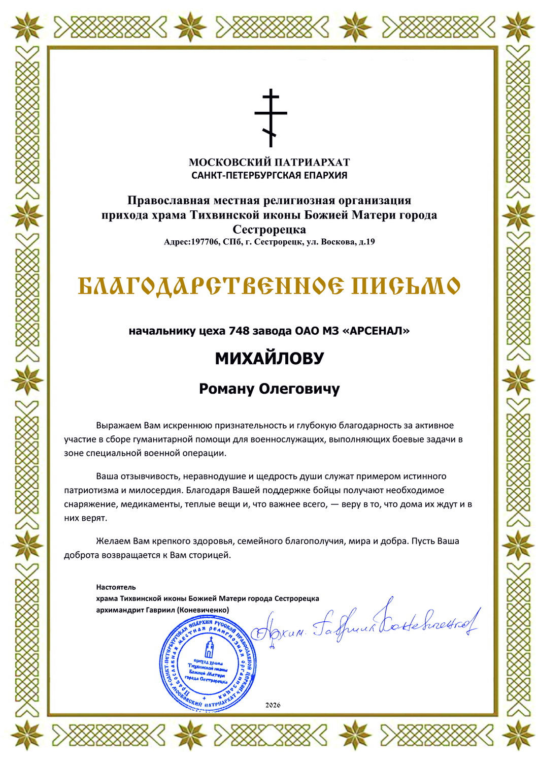 19 февраля по благословению настоятеля храма Тихвинской иконы Божией Матери Сестрорецка, духовника батальона Цесаревича Алексия архимандрита Гавриил (Коневиченко) за участие в гуманитарной миссии Конвоя Памяти Государя Императора Николая II для бойцов батальона Цесаревича Алексия и 116-ой бригады особого назначения, 902-ой полка, казачьего батальона Таврида и лично наказному атаману Боевого отдела Конвоя Памяти Государя Императора Николая II в зоне СВО Д.Г. Терскому, сотрудники ОАО «Машиностроительный завод „Арсенал“ награждены орденским знаком «Император Николай II» и благодарственными письмами.