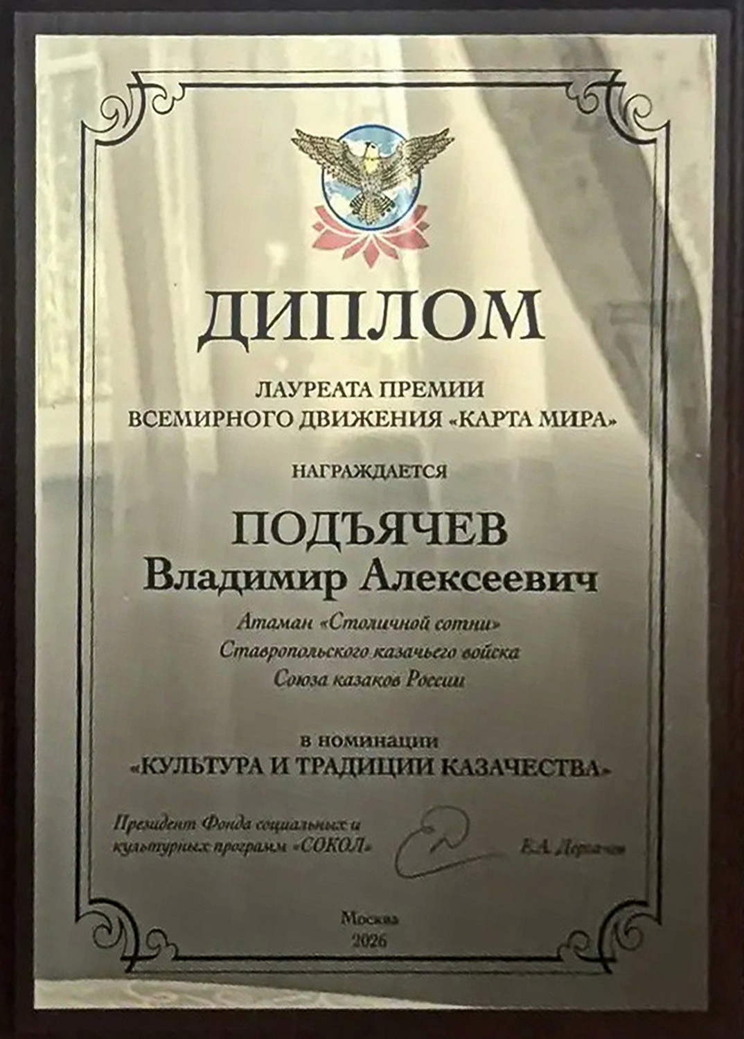 12 марта 2026 года атаман Столичной сотни Ставропольского казачьего войска Союза казаков России, наказной атаман Годуновского отдела Конвоя Памяти Государя Императора Николая II в Подмосковье, войсковой старшина Владимир Алексеевич Подъячев стал лауреатом премии «Карта мира»