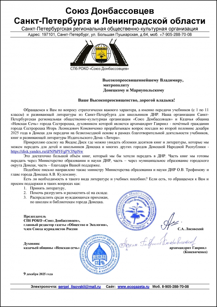 5 декабря 2025 года. Письмо Высокопреосвященнейшему Владимиру, митрополиту Донецкому и Мариупольскому от председателя СПб РОКО «Союз Донбассовцев», главного редактора газеты «Общество и Экология», члена Союза журналистов России С.А. Лисовского и духовника казачьей общины «Невская сечь» архимандрита Гавриила (Коневиченко)