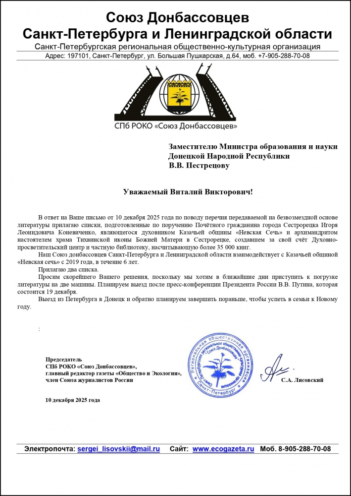 10 декабря 2025 года. Ответ на письмо министру образования и науки Донецкой Народной Республики О.В. Трофимову от председателя СПб РОКО «Союз Донбассовцев», главного редактора газеты «Общество и Экология», члена Союза журналистов России С.А. Лисовского и духовника казачьей общины «Невская сечь» архимандрита Гавриила (Коневиченко)