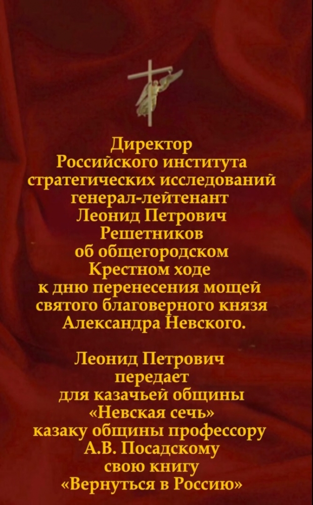 Директор Российского института стратегических исследований генерал-лейтенант Леонид Петрович Решетников об общегородском Крестном ходе к дню перенесения мощей святого благоверного князя Александра Невского. Леонид Петрович передает для казачьей общины «Невская сечь» казаку общины профессору А.В. Посадскому свою книгу «Вернуться в Россию»
