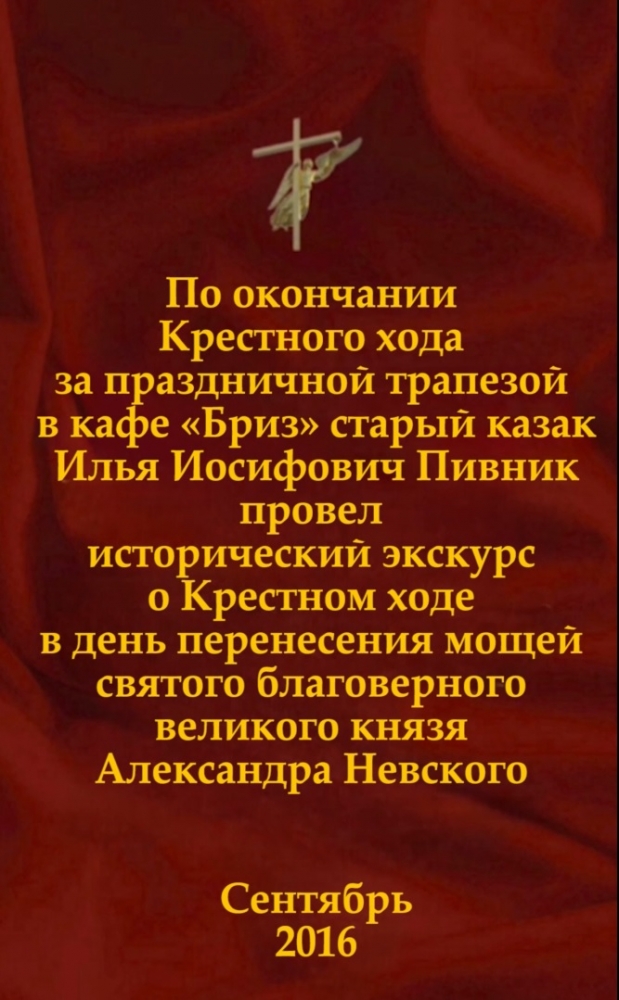 По окончании Крестного хода за праздничной трапезой в кафе «Бриз» старый казак Илья Иосифович Пивник провел исторический экскурс о Крестном ходе в день перенесения мощей святого благоверного великого князя Александра Невского. Сентябрь 2016