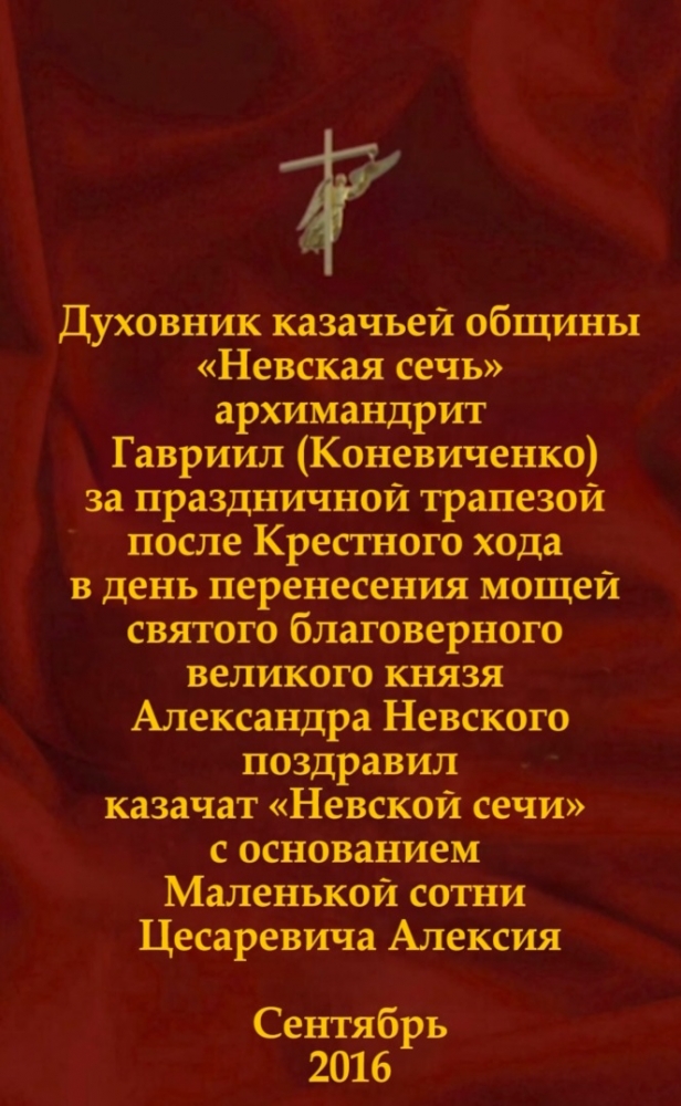 Духовник казачьей общины «Невская сечь» архимандрит Гавриил (Коневиченко) за праздничной трапезой после Крестного хода в день перенесения мощей святого благоверного великого князя Александра Невского поздравил казачат «Невской сечи» с основанием Маленькой сотни Цесаревича Алексия. Атаман Ставропольского казачьего войска Дмитрий Владимирович Стригунов выступил с приветственным словом, а также вновь выбранный атаман Маленькой сотни Дионисий Игоревич Коневиченко обратился с пожеланиями к своим подчиненным казачатам Маленькой сотни. Сентябрь 2016