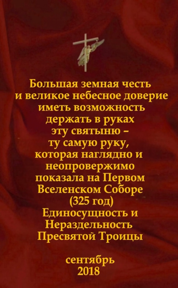 Большая земная честь и великое небесное доверие иметь возможность держать в руках эту святыню – ту самую руку, которая наглядно и неопровержимо показала на Первом Вселенском Соборе (325 год) Единосущность и Нераздельность Пресвятой Троицы. Сентябрь 2018
