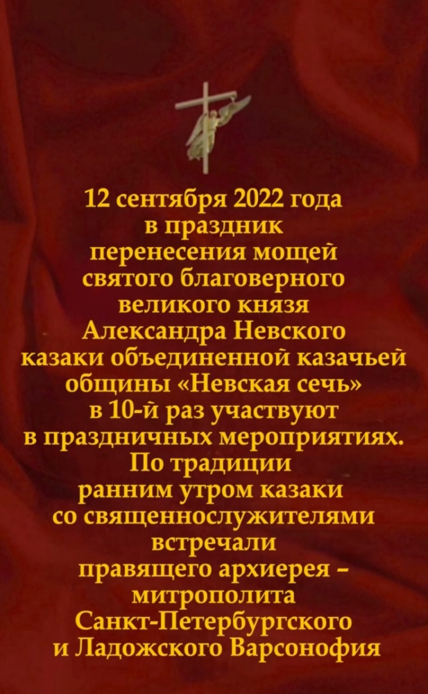 2 сентября 2022 года в праздник перенесения мощей святого благоверного великого князя Александра Невского казаки объединенной казачьей общины «Невская сечь» в 10-й раз участвуют в праздничных мероприятиях. По традиции ранним утром казаки со священнослужителями встречали правящего архиерея – митрополита Санкт-Петербургского и Ладожского Варсонофия