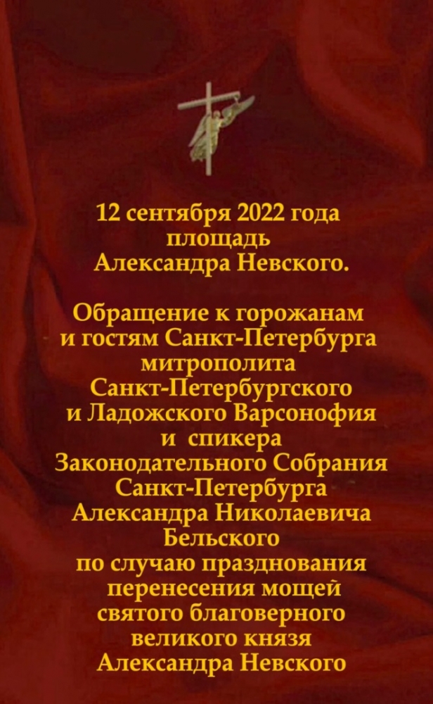 12 сентября 2022 года площадь Александра Невского. Обращение к горожанам и гостям Санкт-Петербурга митрополита Санкт-Петербургского и Ладожского Варсонофия и спикера Законодательного Собрания Санкт-Петербурга Александра Николаевича Бельского по случаю празднования перенесения мощей святого благоверного великого князя Александра Невского