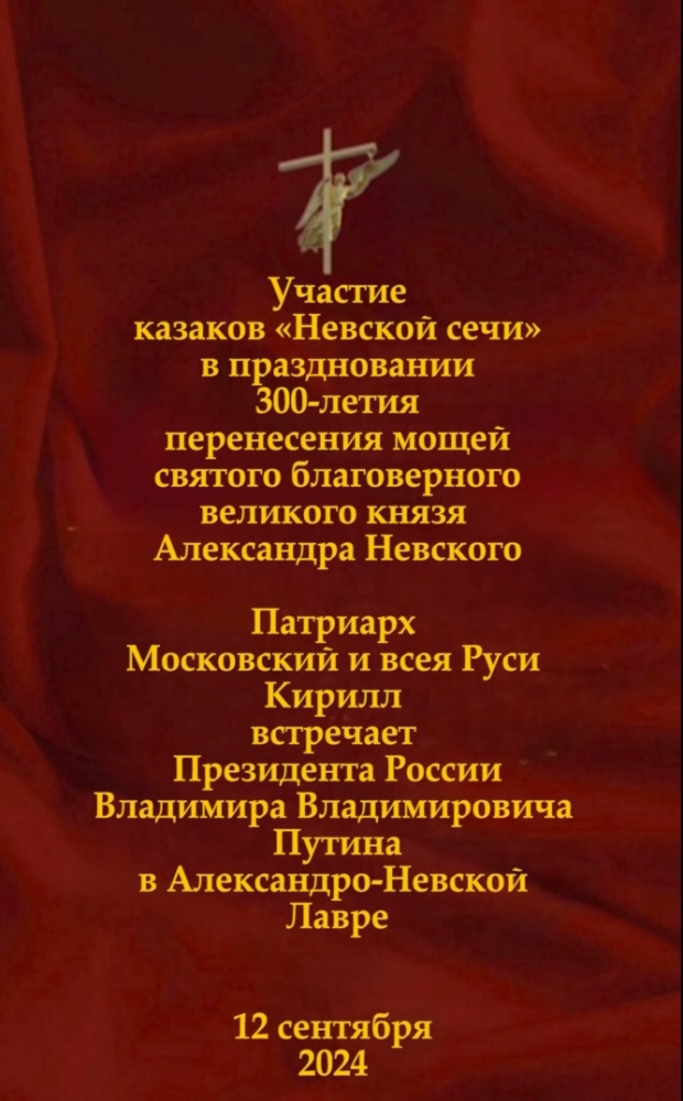 Участие казаков «Невской сечи» в праздновании 300-летия перенесения мощей святого благоверного великого князя Александра Невского. Патриарх Московский и всея Руси Кирилл встречает Президента России Владимира Владимировича Путина в Александро-Невской Лавре 12 сентября 2024