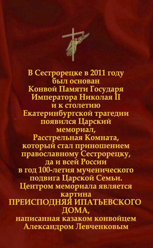 В Сестрорецке в 2011 году был основан Конвой Памяти Государя Императора Николая II и к столетию Екатеринбургской трагедии появился Царский мемориал, Расстрельная комната, который стал приношением православному Сестрорецку, да и всей России в год 100-летия мученического подвига Царской Семьи. Центром мемориала является картина «Преисподняя Ипатьевского дома», написанная казаком-конвойцем Александром Левченковым