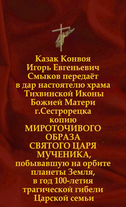 Казак Конвоя Игорь Евгеньевич Смыков передает в дар настоятелю храма Тихвинской иконы Божией Матери города Сестрорецка копию мироточивого образа святого Царя-мученика, побывавшую на орбите планеты Земля, в год 100-летия трагической гибели Царской семьи