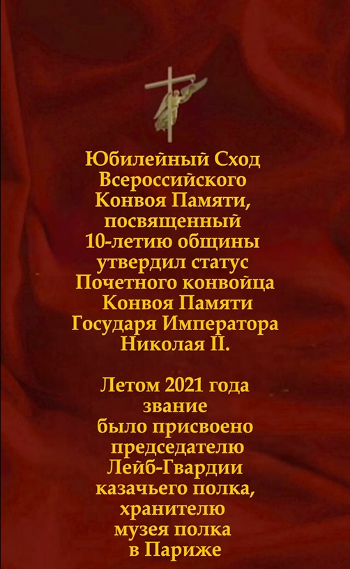 Юбилейный Сход Всероссийского Конвоя Памяти, посвященный10-летию общины утвердил статус Почетного конвойца Конвоя Памяти Государя Императора Николая II. Летом 2021 года звание было присвоено председателю Лейб-Гвардии казачьего полка, хранителю музея полка в Париже