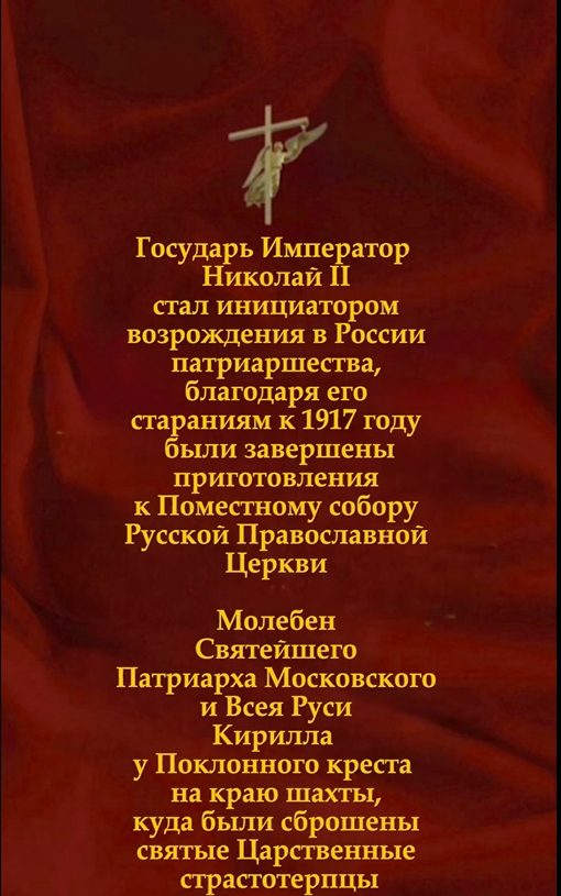 Государь Император Николай II стал инициатором возрождения в России патриаршества, благодаря его стараниям к 1917 году были завершены приготовления к Поместному собору Русской Православной Церкви. Молебен Святейшего Патриарха Московского и Всея Руси Кирилла у Поклонного креста на краю шахты, куда были сброшены святые Царственные страстотерпцы