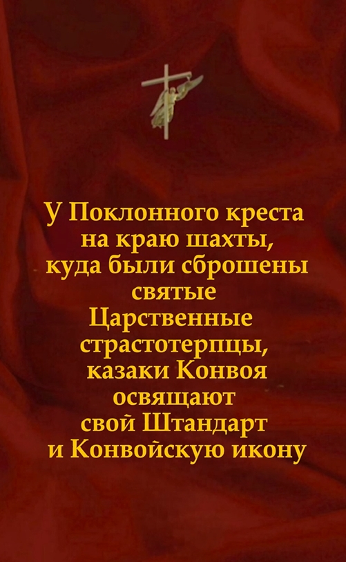 У Поклонного креста на краю шахты, куда были сброшены святые Царственные страстотерпцы, казаки Конвоя освящают свой Штандарт и Конвойскую икону
