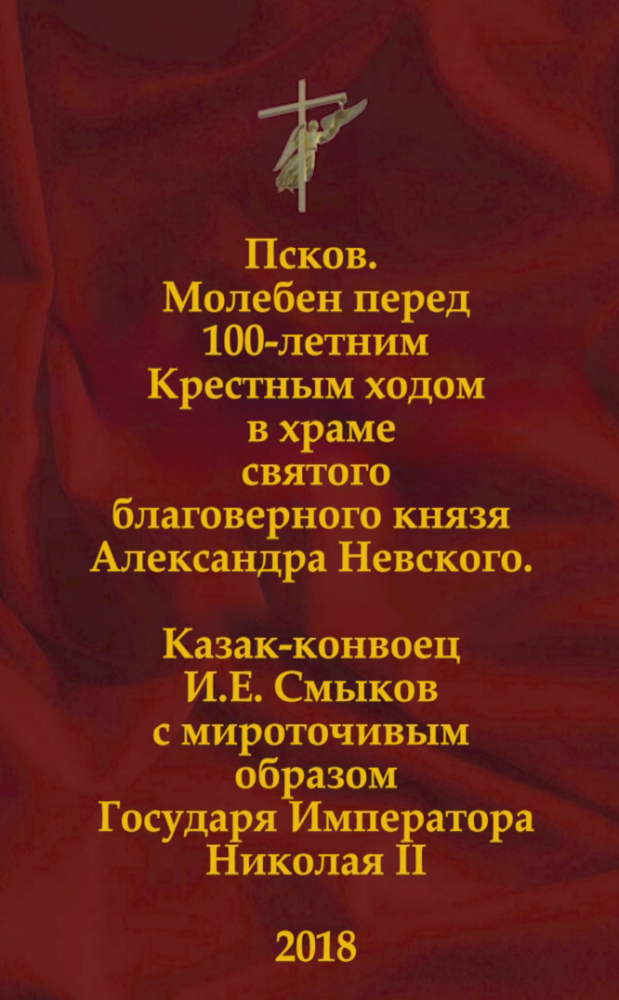 Псков. Молебен перед 100-летним Крестным ходом в храме святого благоверного князя Александра Невского. Казак-конвоец И.Е. Смыков с мироточивым образом Государя Императора Николая II. 2018
