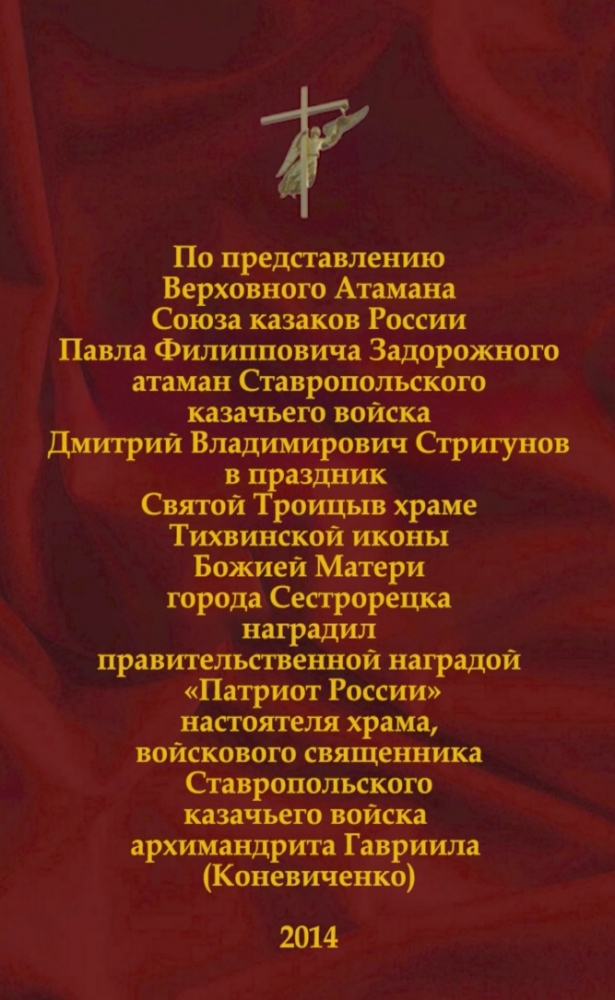 По представлению Верховного Атамана Союза казаков России Павла Филипповича Задорожного атаман Ставропольского казачьего войска Дмитрий Владимирович Стригунов в праздник Святой Троицы в храме Тихвинской иконы Божией Матери города Сестрорецка наградил правительственной наградой «Патриот России» настоятеля храма, войскового священника Ставропольского казачьего войска архимандрита Гавриила (Коневиченко). 2014