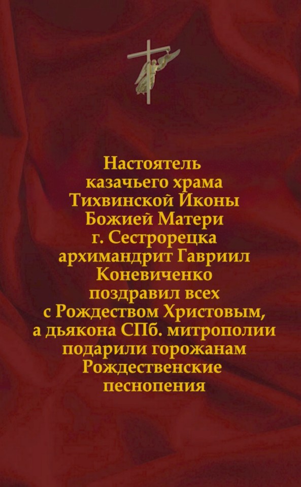 Настоятель казачьего храма Тихвинской иконы Божией Матери города Сестрорецка архимандрит Гавриил (Коневиченко) поздравил всех с Рождеством Христовым, а дьякона Санкт-Петербургской митрополии подарили горожанам Рождественские песнопения