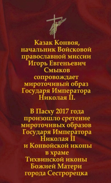 Казак Конвоя, начальник Войсковой православной миссии Игорь Евгеньевич Смыков сопровождает мироточивый образ Государя Императора Николая II. В Пасху 2017 года произошло сретение мироточивых образов Государя Императора Николая II и Конвойской иконы в храме Тихвинской иконы Божией Матери города Сестрорецка
