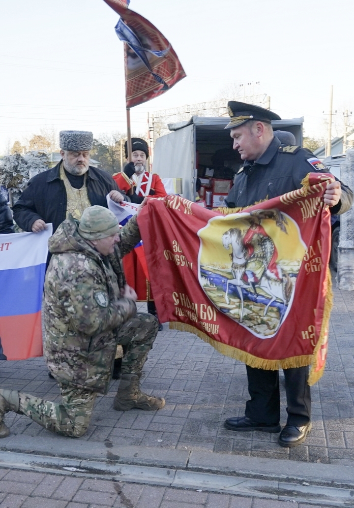 Командир диверсионно-разведывательной группы батальона Андрей (позывной — «Феникс») коленопреклоненно принял стяг, чтобы доставить его вместе с гуманитарным грузом на фронт. Он поблагодарил тех, кто помогает бойцам, для которых вручение боевого символа — высокая честь и ответственность.