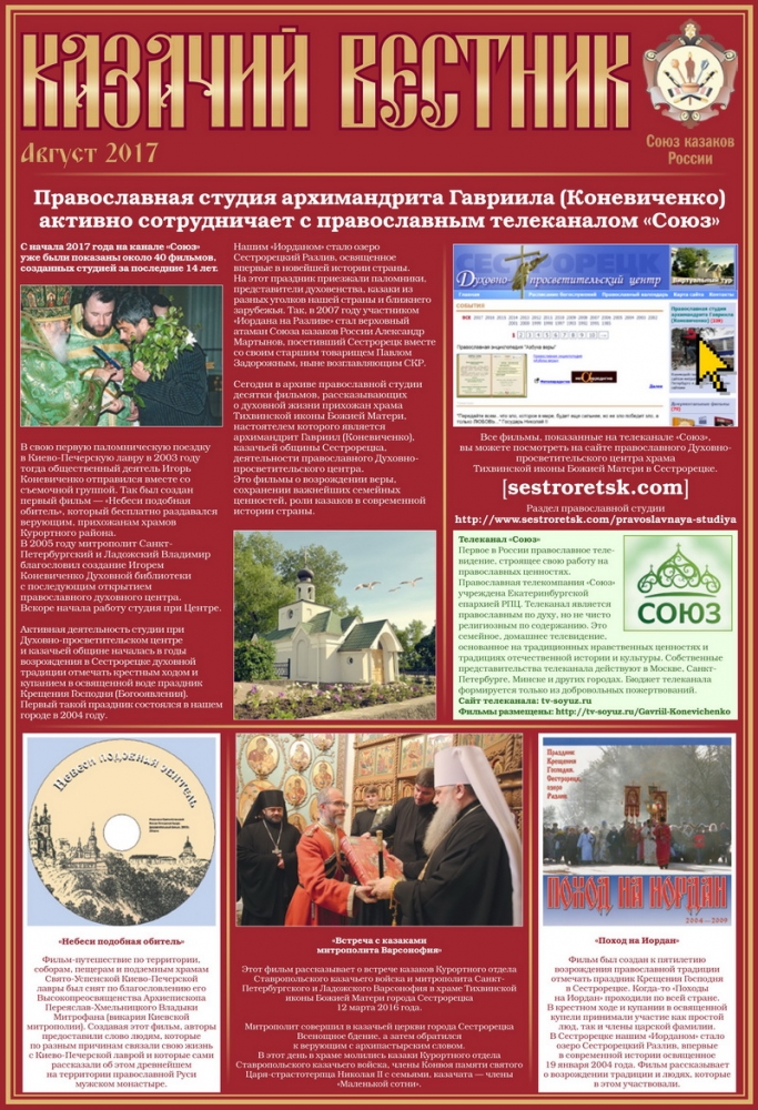 Август 2017 года. Издан очередной номер Казачьего вестника Невской сечи. Тема номера: Православная студия архимандрита Гавриила (Коневиченко) активно сотрудничает с православным телеканалом "Союз"