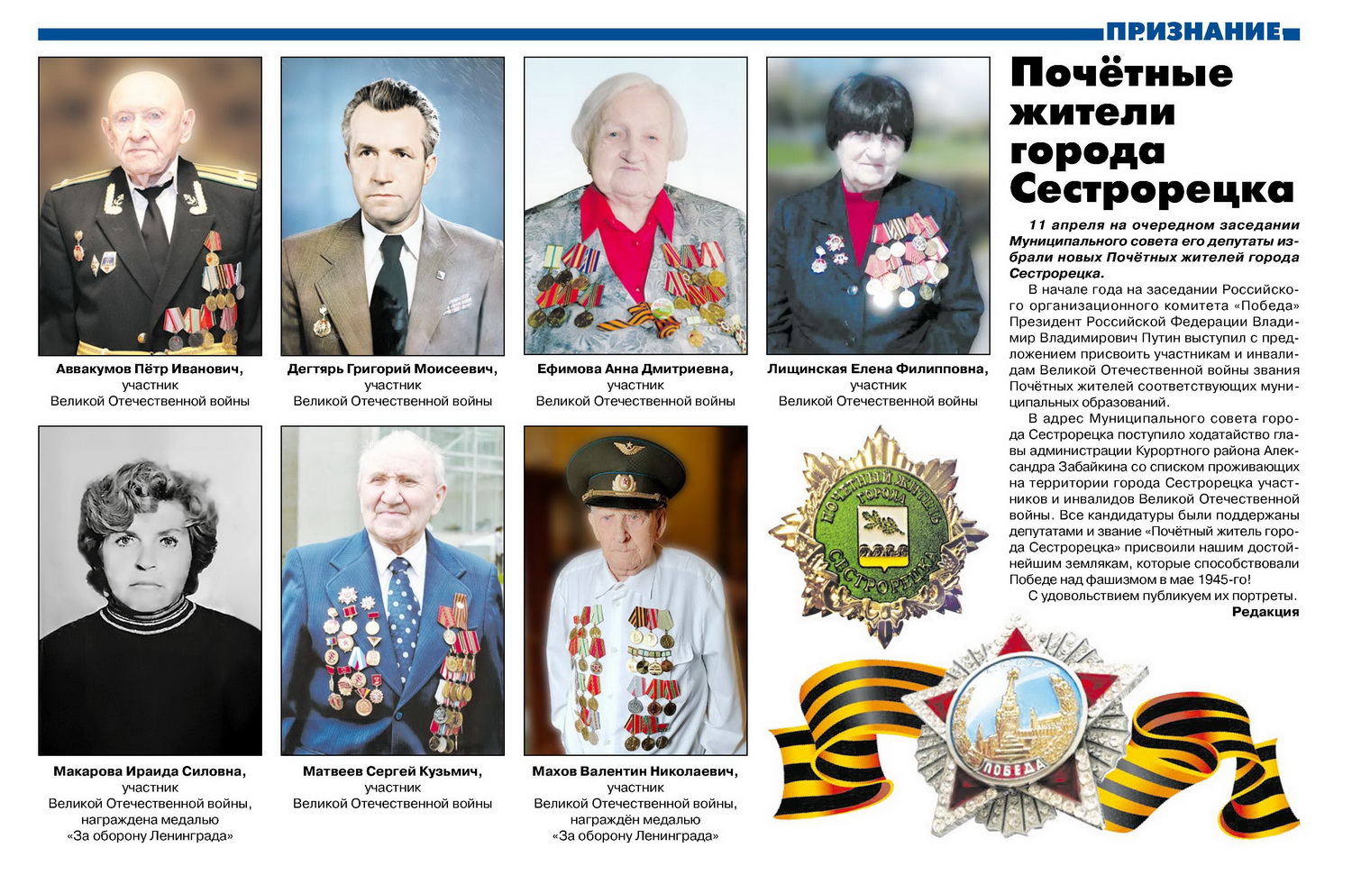 В адрес Муниципального совета города Сестрорецка поступило ходатайство главы администрации Курортного района Александра Забайкина со списком проживающих на территории Сестрорецка участников и инвалидов Великой Отечественной войны, это: Петр Иванович Аввакумов, Григорий Моисеевич Дегтярь, Анна Дмитриевна Ефимова, Елена Филипповна Лищинская, Ираида Силовна Макарова, Сергей Кузьмич Матвеев, Валентина Николаевича Махова и Галина Алексеевна Цыганова. Муниципальный совет Сестрорецка принял решение присвоить звание «Почетный житель Сестрорецка» этим достойнейшим людям.